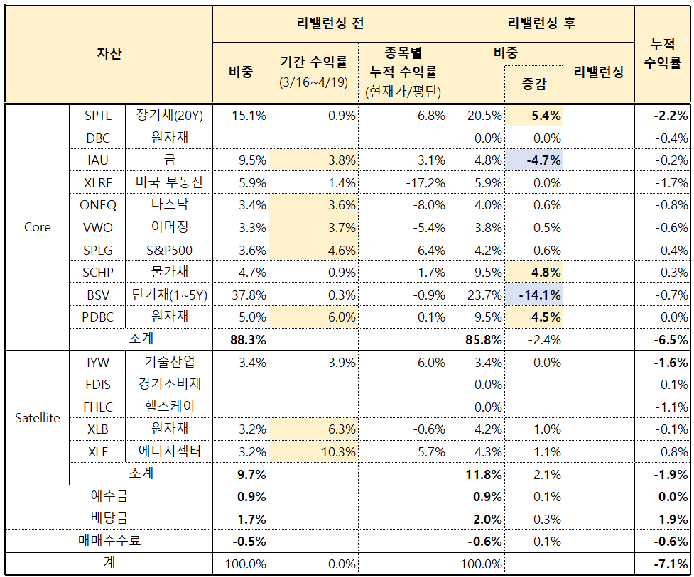 ○ 단기채 (BSV)를 -14% 줄이고, 장기채 (SPTL), 물가채 (SCHP), 원자재 (PDBC) 및 각 종 주식류와 위성 ETF들의 비중을 증가시켰습니다.