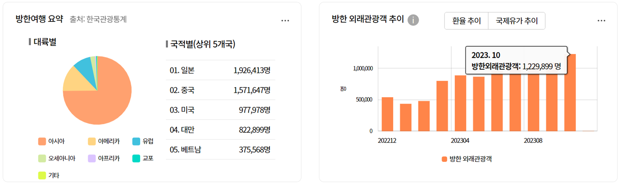 - 방한 시장 동향을 보면 23년에는 계속 증가하고 있음. 23년 10월 123만명을 기록하여, 9월 101만명보다 소폭 증가함