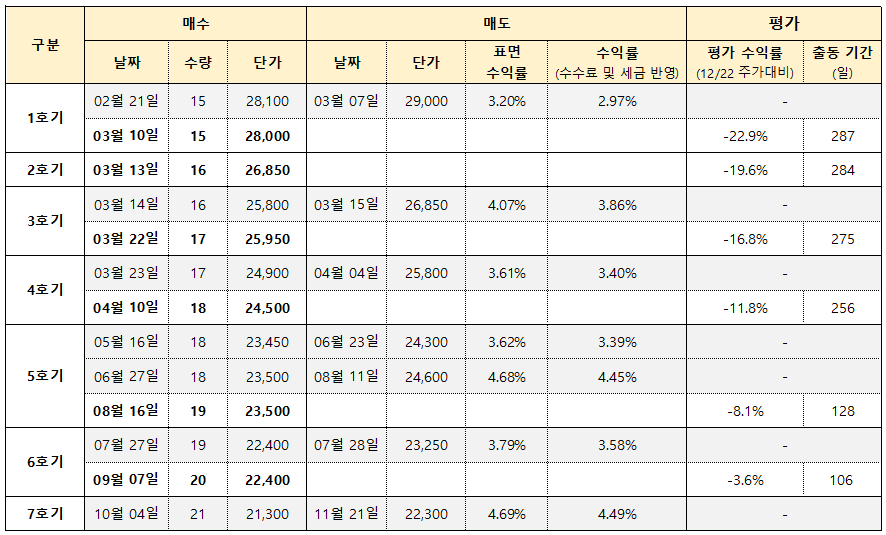 ○ (매매 없음) 11/23~12/22 약 한 달 동안 주가는 21,600원~22,500원 사이에서 횡보하고 있어 매매기회가 오지 않았습니다. 11/21에 발표한 주주환원 정책에도 불구하고 주가는 다시 하락세를 기록하고 있습니다 (12/22 현재 21,600원 기록 중)