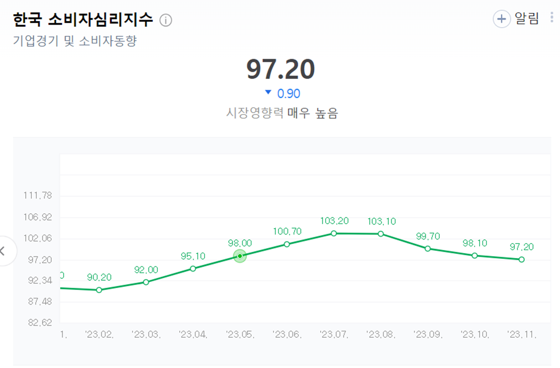 - 다만 소비자심리지수가 지속적으로 하락 중이며, 반등의 기미가 보이지 않고 있습니다