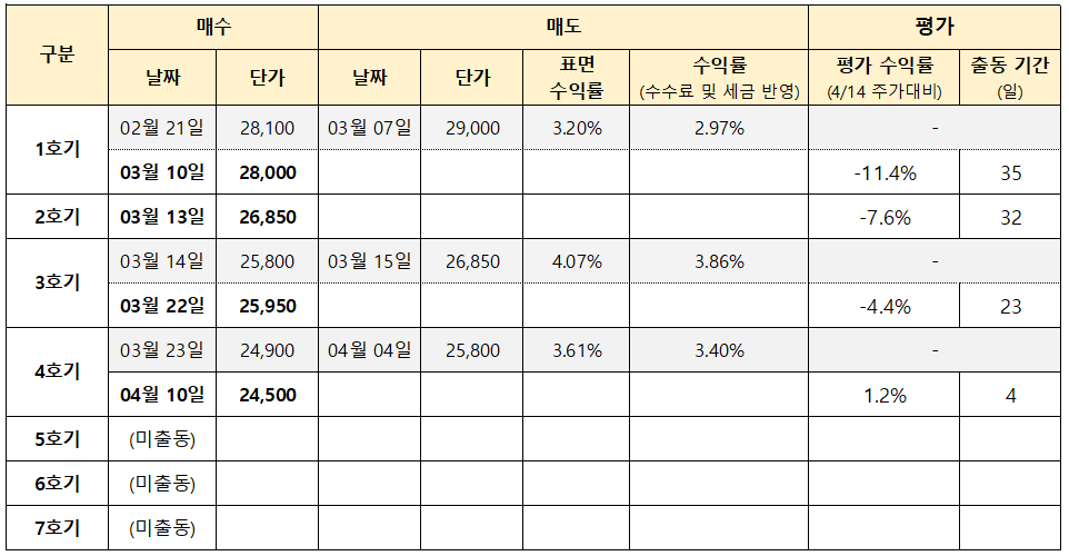 ○ 3/24~4/14 기간 동안 나이스정보통신은 -1.0%를 기록했으며, 종가 기준 최고가는 25,850원이었습니다 (4월 4일). 이때 4호기를 한 번 매도하였고, 다시 주가가 하락하여 4호기를 재출동 하였습니다.