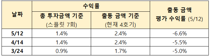 ○ 4/14 ~ 5/12 기간 동안 주가는 23,800 ~ 25,000원의 박스권에 있었어서 매수 또는 매도의 기회가 없어, 수익률의 변화는 없습니다. 사실 스플릿 투자를 하면서 매수/매도 기회가 많이 있을 것이라 예상했는데, 실제로 투자를 해보니 생각보다 매수기회가 많지는 않았습니다.