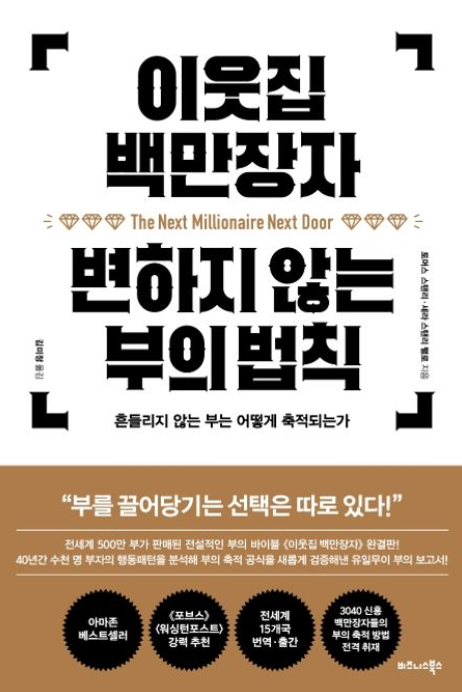 오늘은 도서 「이웃집 백만장자」를 추천드리며, 본 책을 통해 순자산 10억원 (백만장자)가 되는 방법에 대해 생각해보려고 합니다. 책의 핵심은 부자의 길은 느리고도 꾸준한 일상의 혁명이며, 누구나 절제하고 체계적으로 재산을 모으면 부자가 될 수 있다고 말합니다. 따라서 책은 소득 대비 재산이 많은 사람과 소득 대비 재산이 적은 사람을 비교함으로써 부자가 되기 위한 행동을 제시합니다. 물려받은 재산이 없는 일반인들이 부자가 되기 위해 반드시 읽어야할 책이라고 생각됩니다.