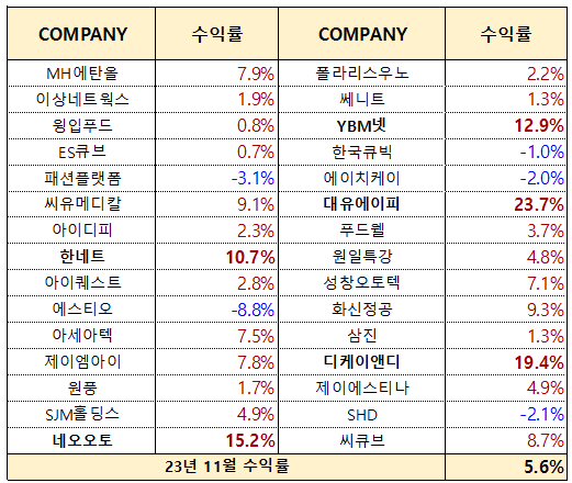 ○ 특히 굵은 글씨의 5개 종목(한네트, 네오오토, YBM넷, 대유에이피, 디케이앤디)은 +10%을 기록하며 수익률을 이끌었습니다