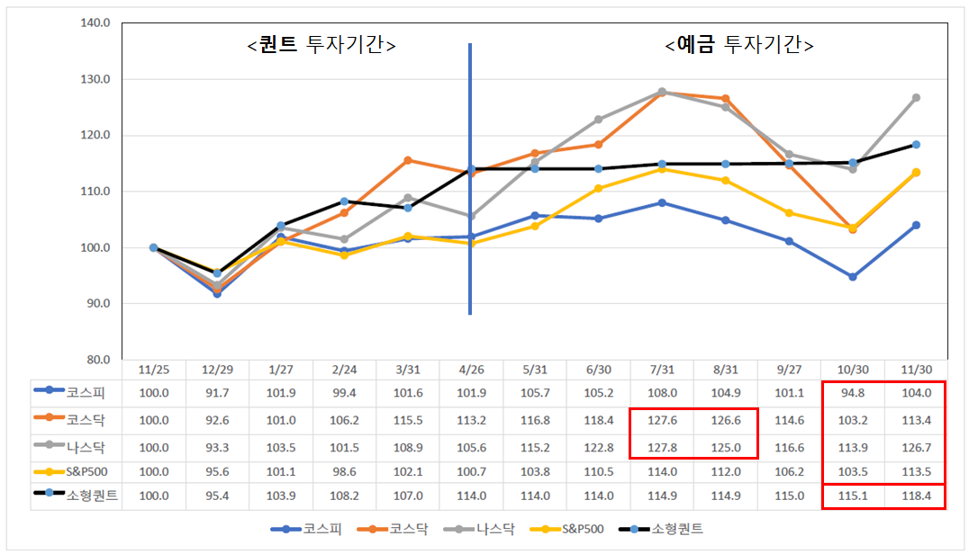 ○ 이번 11월에는 한 번도 100(투자금액) 이하로 내려간 적이 없는 편안한 투자기간이었습니다
