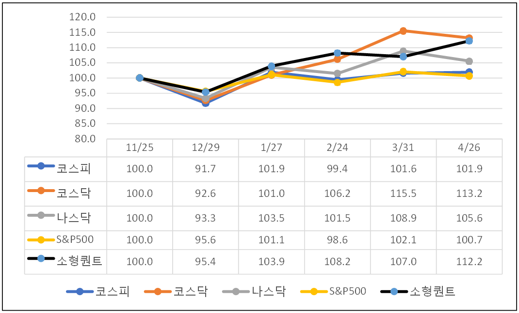 첫 투자를 했던 22년 11월 25일을 기준 (100)으로 하여 변동성을 체크해 보았습니다. 그동안 가장 많이 상승한 것은 코스닥으로 +13.2% 상승했으며 다른 벤치마크들은 0.7~3.2%의 상승했습니다. 제가 투자한 소형퀀트의 경우 위에서 본 것 같이 +12.2%를 기록하여 벤치마크들과 비교해서도 준수한 성적을 냈습니다.