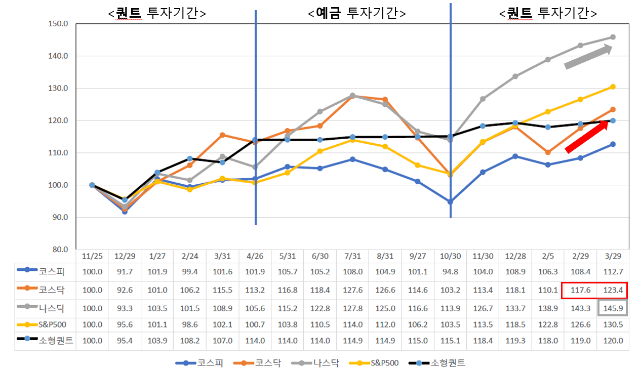 ㅇ이에 반해 퀀트 투자는 +1.0%대의 밴치마크 대비 저조한 성과를 보여주었습니다.