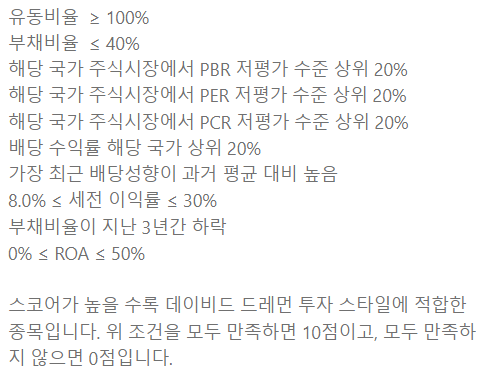 저는 드레먼 역발상 스코어(상위 20%)에 소형주 팩터(시가총액 하위 20%)를 적용한 전략을 사용하고 있습니다. 윙입푸드는 투자당시 시가총액 400억원 수준으로 소형주 하위 20%에 해당 하였습니다. 또한 드레먼 역발상 스코어는 총 6점으로 10가지 항목 중 6가지가 해당되어 투자하게 되었습니다.