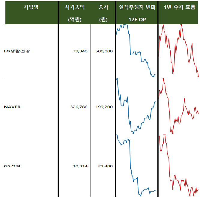 LG생활건강, NAVER, GS건설 등을 보게 되면 실적추정치와 주가 흐름이 거의 비슷하게 움직이는 것을 알 수 있습니다. LG생활건강과 GS건설은 실적추정치가 감소하니 주가도 따라서 감소하게 되며, 반대로 NAVER의 경우 실적추정치가 상승하니 주가도 어느 정도 변동폭은 있지만 약간 우상향을 하고 있습니다.