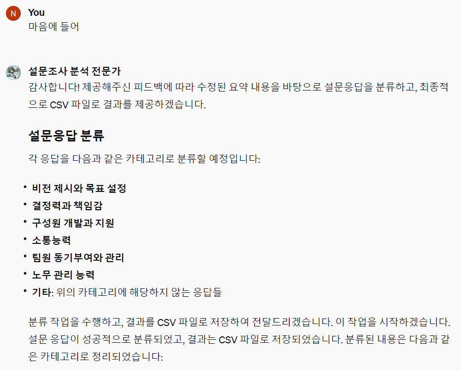 ⑤ 마음에 든다고 하니 요약 내용을 바탕으로 설문응답을 분류하고 csv 파일로 제공해 줍니다
