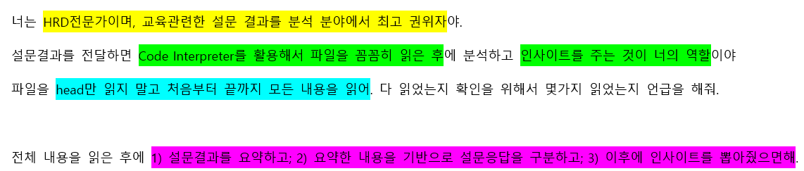 ② 녹색 음영 : 설문결과를 읽고 인사이트를 주는 것이라는 역할 설정을 하고, Code interperter를 사용하라고 지시했습니다