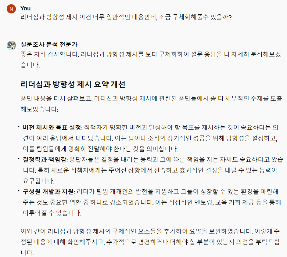 ④ '리더십과 방향성 제시'가 구체성이 떨어진다고 의견을 주었습니다. '설문조사 분석 전문가'는 요약을 조정해 줍니다