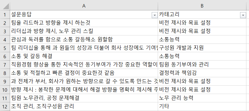 1) 저는 서술형 설문조사를 분석할 때 문장 하나하나 읽어가며 2~3개 단어로 간단한 요약