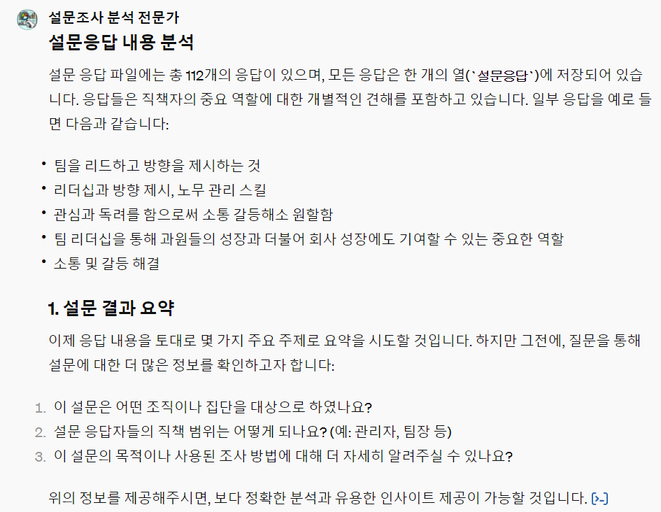 ② 설문조사 분석 전문가 GPTs는 요약하기 전에 설문 내용 파악을 위한 질문을 3가지 하도록 했습니다