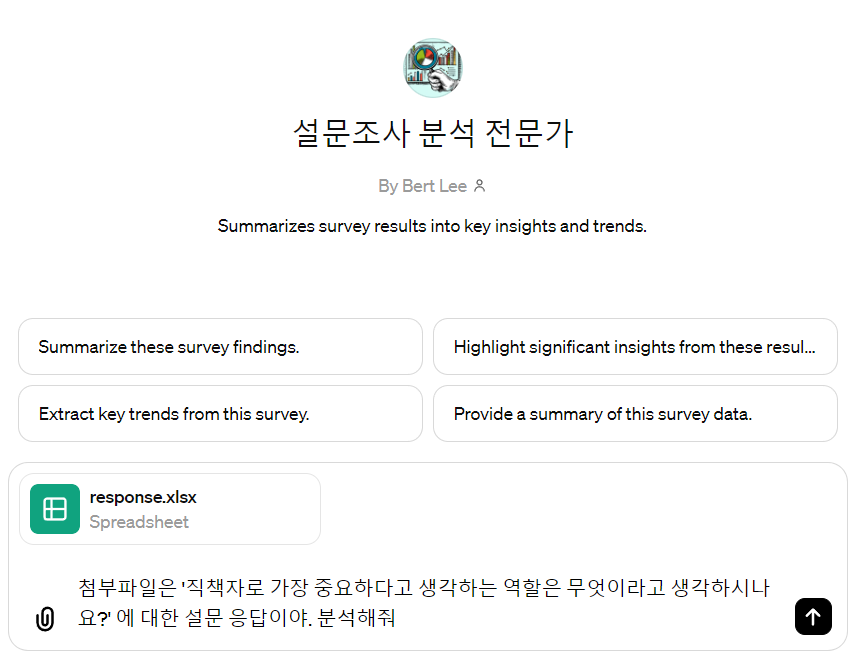 실질적인 프롬프트 구경에 앞서서 만들어진 GPTs를 통해 설문을 분석하는 것을 보여드리겠습니다
