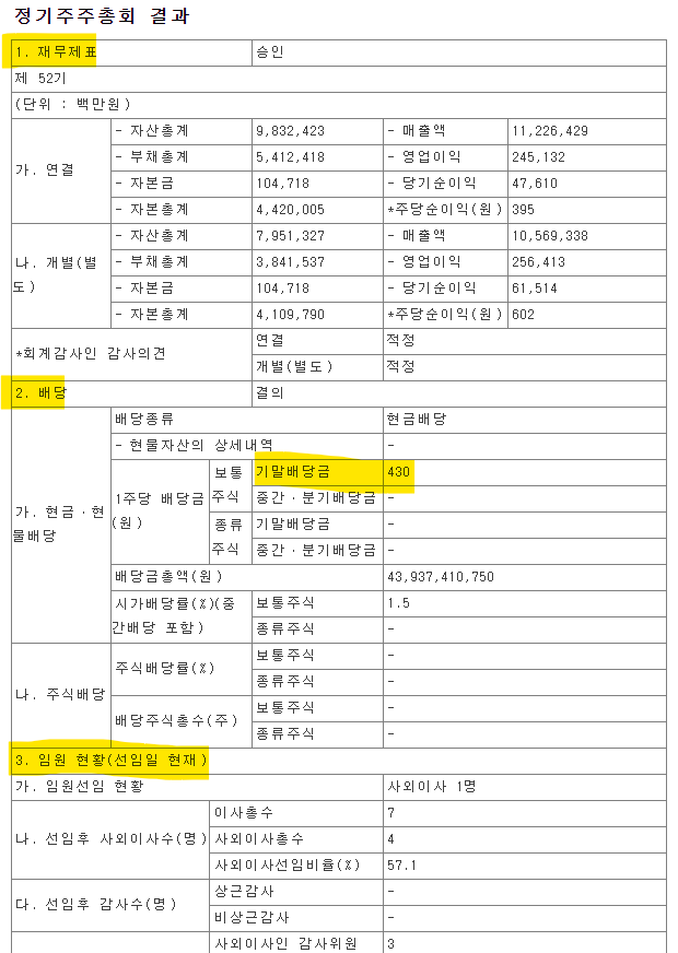 정기주주총회에서는 1) 재무제표를 승인했고; 2) 배당액을 결의했고; 3) 임원(사외이사)을 선입했습니다. 그중 우리가 오늘 관심 있는 것은 주당 배당금이며 2022년 GS리테일은 주당 430원을 배당결의 했습니다 (총 배당액 439억입니다).