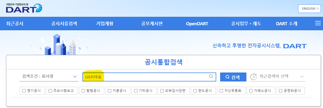 전자공시시스템에 접속하셔서 검색란에 보유하고 있는 종목을 입력합니다