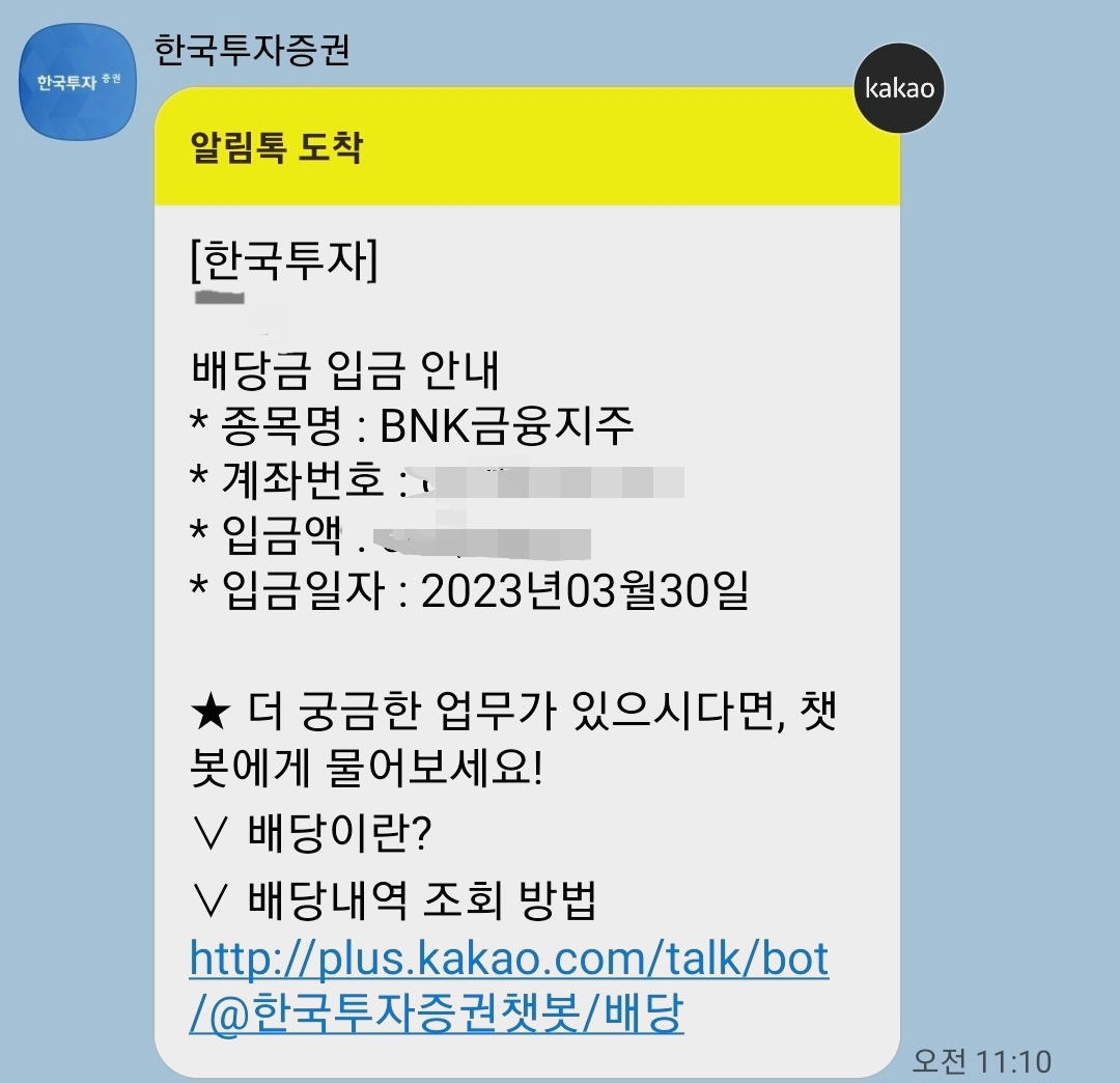 최근 배당금 자체는 문자 또는 카카오톡 알림으로 많이 보내주고 있습니다. 아래는 한국투자증권의 예시인데, 종목과 입금액(배당금), 그리고 입금일자를 안내해 줍니다. 그러나 제가 알고 싶은 것은 주당 배당금이며 이를 알아야 시가배당률을 계산할 수 있기 때문입니다.