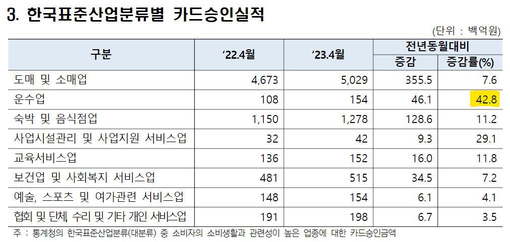 - 23년 4월 전체카드 승인금액 및 승인건수는 전년 동기대비 7.1%, 4.1% 증가함
