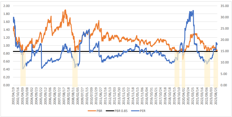 1. 2002/04 ~ 2023/9월 까지 코스피 PBR, PER 차트