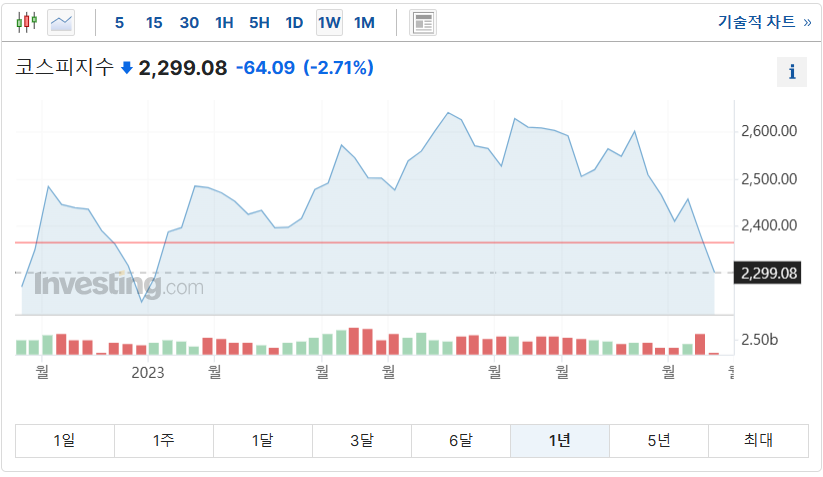 2023년 10월 26일 코스피는 2299.08을 기록하며 2300이 깨졌습니다. 10월 26일 기준 코스피의 PBR은 0.83, PER는 17.24, 배당수익률은 2.15%입니다 (출처 : KRX 정보데이터시스템). 아래 차트에서 보이듯 최근 코스피는 급격하게 하락하고 있는데, 언제쯤 매수해야 무릎일까? 언제 반등할까? 하는 고민이 많을 것으로 예상됩니다.