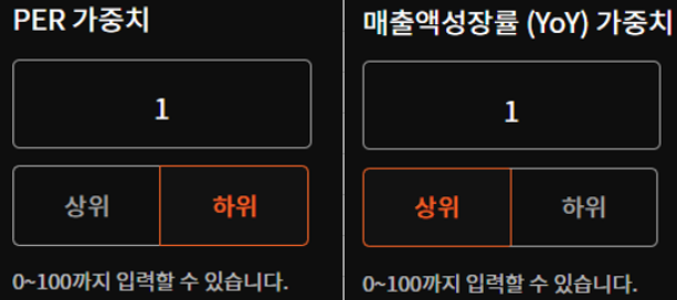 예를 들어서 PER 하위 조건과 매출성장률 상위 조건을 선택하면,