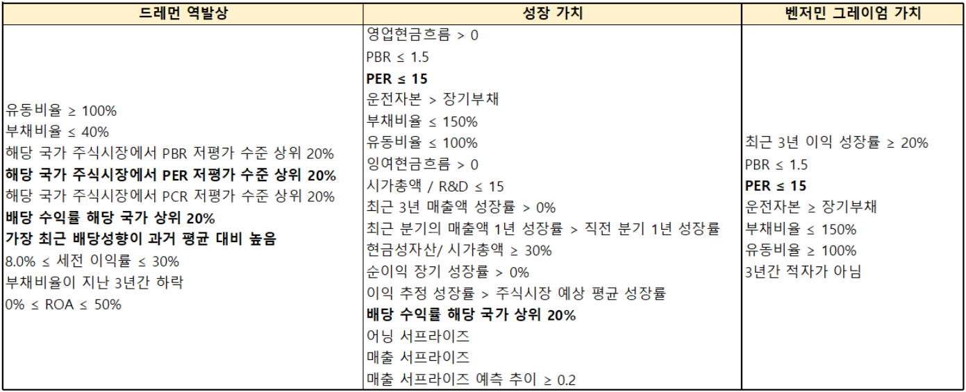 투자 성과가 잘 나왔던 전략들의 세부 팩터들을 살펴보면, PER가 하위 20%, 15이하 등의 저평가주에 대한 조건들과 배당 수익률이 높은 종목을 찾는 팩터도 있었습니다. 다만 저평가 + 배당 우수 한 종목을 찾는 팩터를 가지고 있는 '주주 성장 전략'이 상대적으로 낮은 수익률을 기록했는데 그 원인은 잘 모르겠습니다...