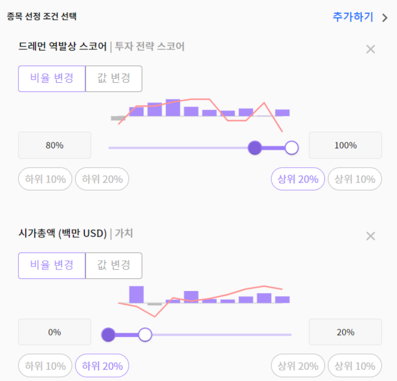 이를 실제 테일러에서 구현해 보면 아래와 같이 두 가지 팩터를 같이 적용할 수 있습니다. 스코어 전략은 높은 것이 좋으니 상위 20%에 투자하고 시가 총액은 상위 20%, 하위 20%에 대해 백테스트를 돌려보았습니다.