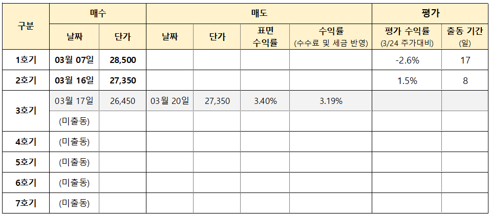 ○ 3/7일 기준 28,750원이었던 주가가 3/24일 27,750원으로 -3.5% 하락했습니다. 이 기간 동안 주가는 종가기준 26,700원까지 하락했었는데, 이때 3호기가 출동하여 3.19%의 수익을 냈습니다.