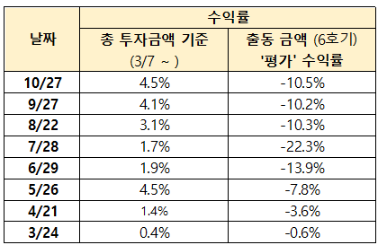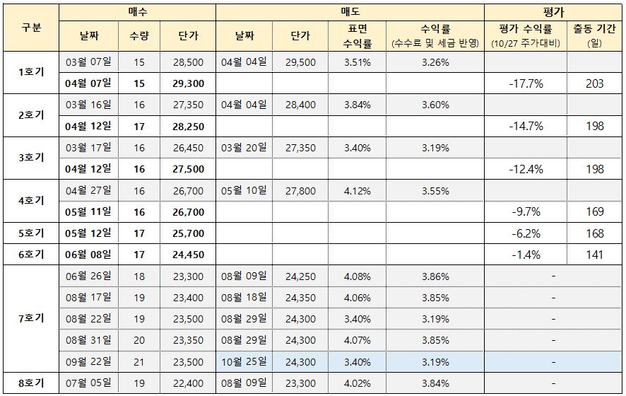 ○ 복리효과는 이번 7호기 매도에서 더 확실히 볼 수 있었는데, 8월 29일에 매도와 10월 25일의 매도는 (23,500 → 24,300)으로 같아 수익률은 3.19%이지만 실세 수익은 (14,248원 → 15,741원)으로 증가하였습니다.
