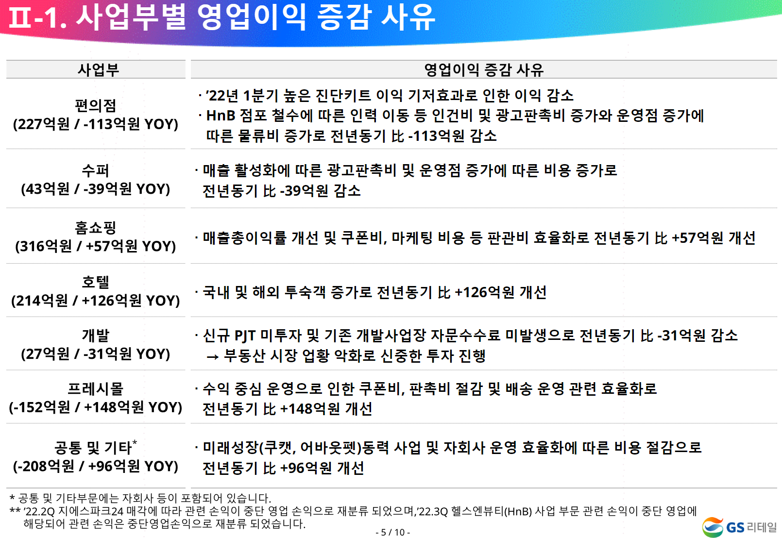 사업부별 영업이익 증감의 상세내용은 IR자료에서 가져왔으며 23년 1분기의 경기가 좋지 않았어서 편의점의 실적이 좋지 않았던 것 같습니다. 다만 호텔의 실적개선, 기타부분에서의 적자 축소가 긍정적으로 평가됩니다.