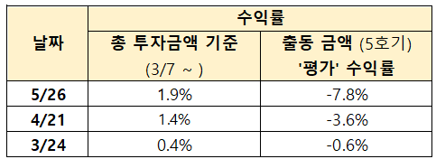 ○ 이번 기간 동안 0.5%의 수익을 달성하였고, 이 추세로 이어진다면 연간 8%의 수익을 기대할 수 있지 않을까 생각됩니다. 1번의 매도를 하면 전체 수익률에 0.5% 정도를 기여하는 것 같습니다 (현재까지 총 4번 매도).