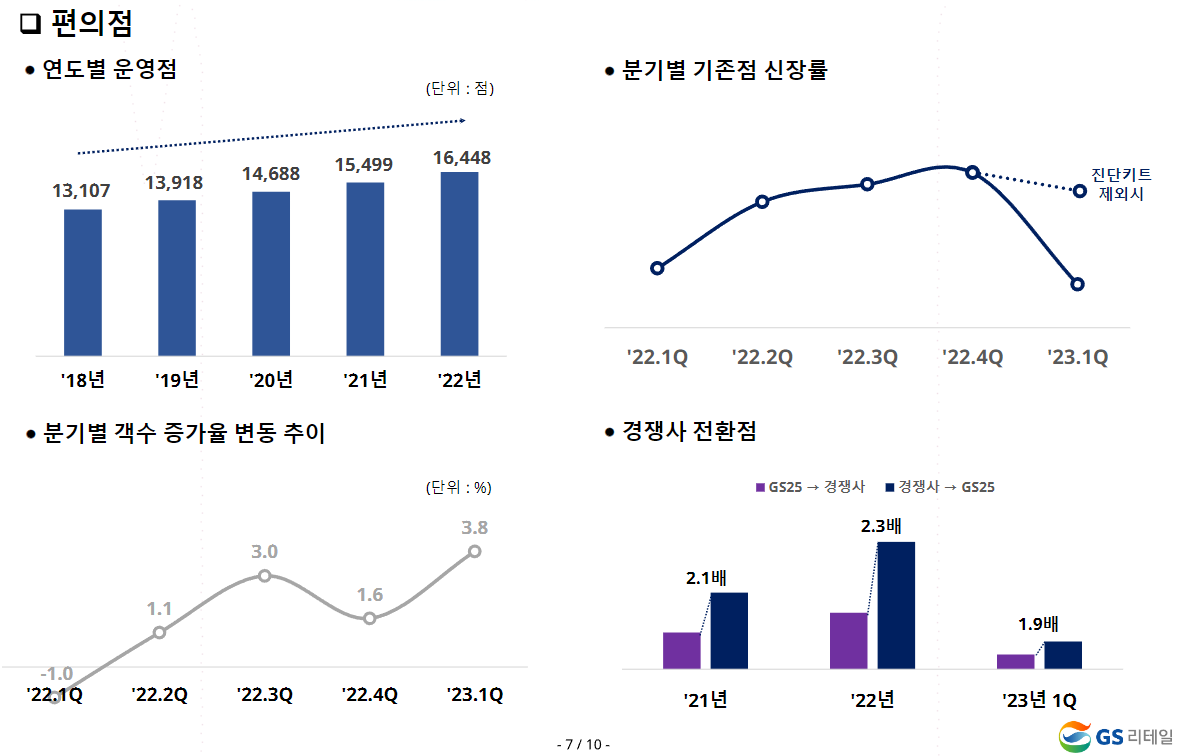 ○ 편의점 : 운영 점포도 계속 증가하고 있고, 경쟁사에서 GS리테일로 변경하는 숫자도 증가하고 있습니다. 분기별 객수 증가율도 3.8%로 증가하고 있으나, 기존점 신장률이 다소 떨어졌습니다. 2분기가 계절적 성수기임을 고려하면 2분기의 실적이 기대됩니다.