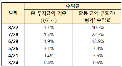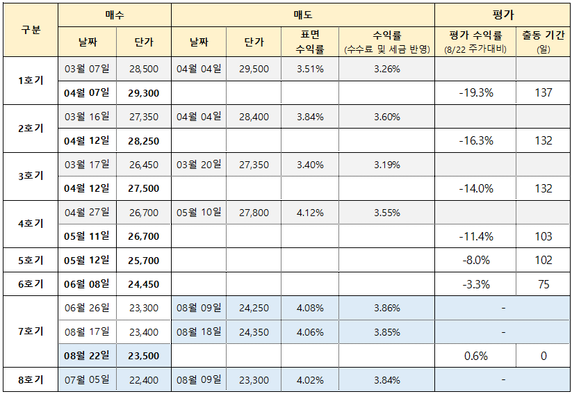 ○ 7/28 ~ 8/22 기간 동안 GS리테일의 주가는 많이 상승해 줘서 출동했던 7, 8호기의 매도기회가 있었고, 변동성으로 인해 총 3번을 매도를 실행했습니다. 현재는 7호기가 출동한 상황입니다.