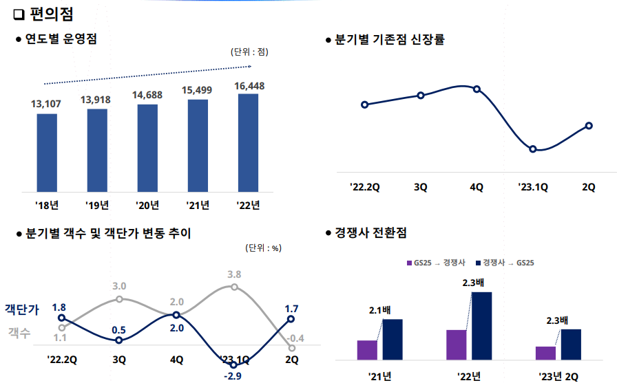 ○ 편의점 : 운영 점포도 계속 증가하고 있고, 경쟁사에서 GS리테일로 변경하는 숫자도 증가하고 있습니다. 객단가는 상승했으나, 분기별 객수의 증가세가 마이너스로 전환했습니다. 기존점 신장률이 반등하고 있어 3분기의 실적이 더 기대됩니다.