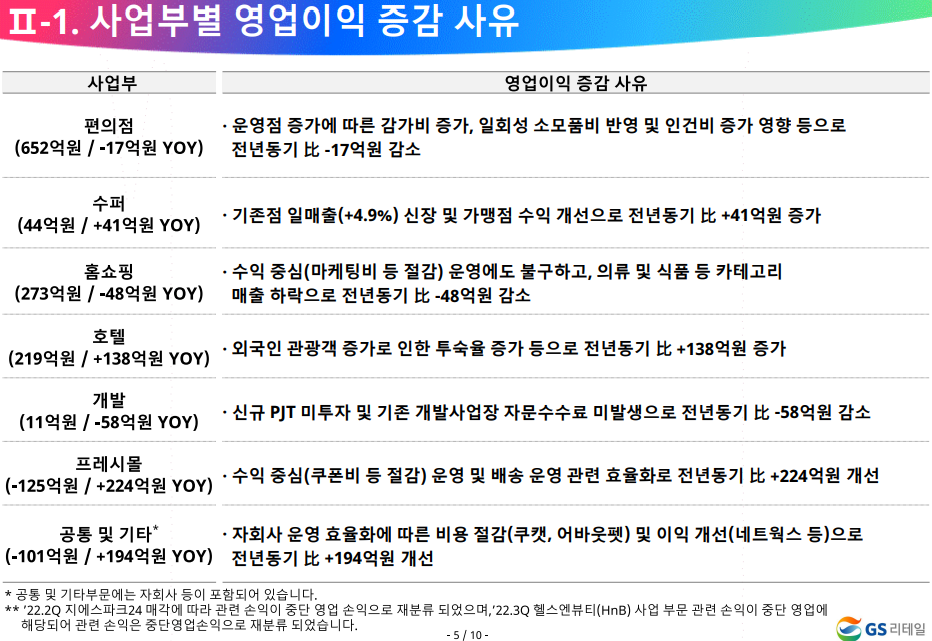 사업부별 영업이익 증감의 상세내용은 IR자료에서 가져왔으며, 실적 서프라이즈의 요인은 편의점이 우려보다는 선방하였고 호텔 사업부와 기타 비용의 축소의 영향이 컸습니다.