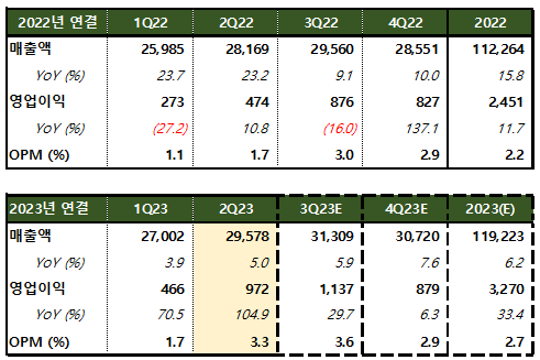 8/8일 GS리테일의 2Q23 실적이 발표되었습니다. 영업이익의 컨센서스였던 802억을 상회한 972억원이라는 서프라이즈 실적이 나왔으며, 작년 2분기의 기저 효과로 YoY +104% 실적입니다. 실적 발표전까지 주가가 수직낙하 하다가 실적 발표 이후에 많이 반등하였습니다.