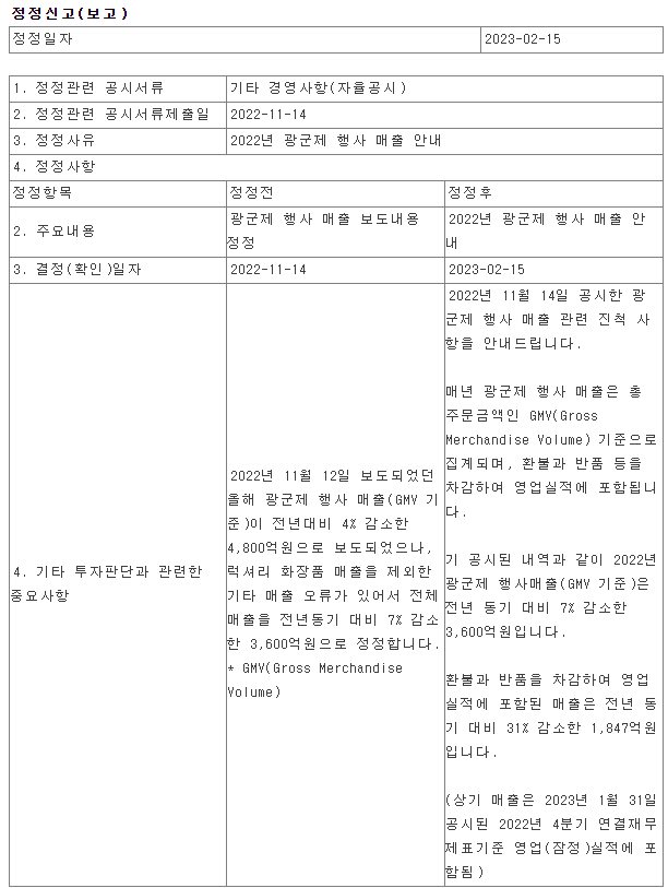LG생활건강의 주가는 중국의 리오프닝 기대로 인해 작년 11월 12월부터 증시 반등을 했다가 22년 4분기 실적이 좋지 않았던 이유도 있고 단기간 많이 상승한 것도 있어 1월 2월은 횡보하는 중입니다. 횡보하는 또 다른 원인은 중국인 입국에 대한 정부의 코로나 정책입니다. 중국의 리오프닝 후 코로나 수가 급증하자 정부는 비자를 받게 하고 PCR 검사를 받게 하는 등 중국인 관광객의 유입을 막는 정책을 펼쳤습니다. 쏟아져 나오는 중국 관광객들이 지연되고 있습니다. 이런 상황에서 LG생활건강은 2월 15일 자율공시를 했습니다. 자율공시는 해도 되고 안 해도 되는 공시입니다. 작년 11월에 있었던 중국의 광군제 행사 매출 보도내용에 대한 정정이며, 기존 4,800억원으로 매출이 보도되었으나 '럭셔리 화장품 매출을 제외한 기타 매출 오류가 있어서 전체 매출을 전년동기 대비 7% 감소한 3,600억원으로 정정' 했습니다. 매년 광군제 행사 매출은 총 주문금액 GMV (Gross Merchandise Volume)으로 집계를 하고 환불과 반품 등을 차감하여 영업실적에 포함시키고 있습니다. 환불과 반품을 차감하여 영업실적에 포함된 매출은 1,847억원으로, 다시 말하면 약 1,800억원의 환불과 반품이 있었다는 의미로 해석됩니다.