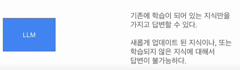- LLM (Large Language Model): GPT처럼 문장을 이해하고 생성할 수 있는 대형 모델입니다. 하지만 고정된 지식만 담고 있어서, 최신 정보나 특정 도구 사용은 불가능합니다