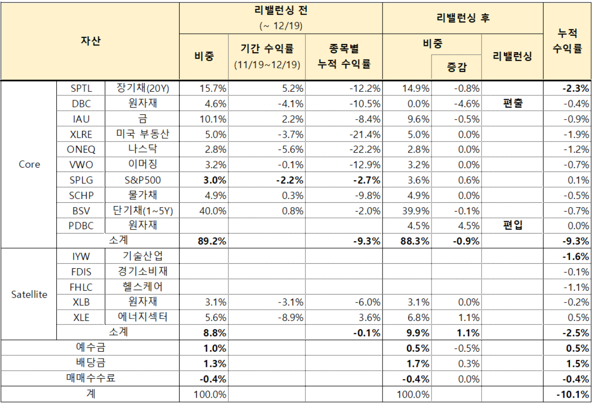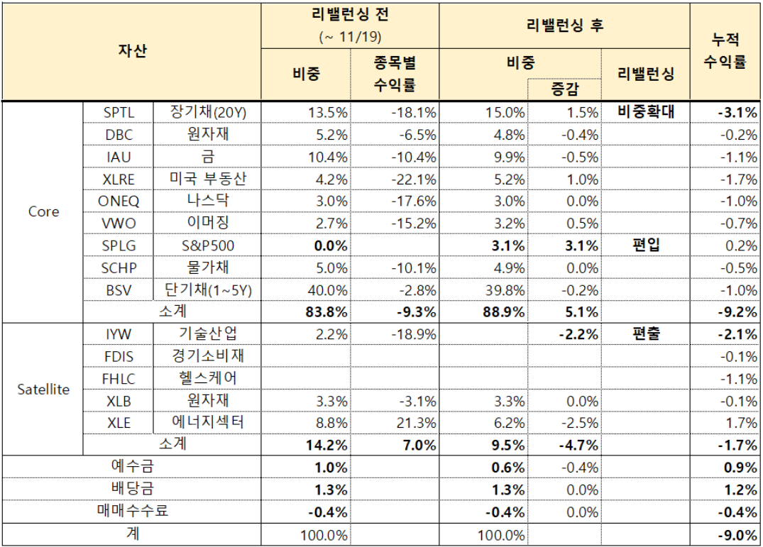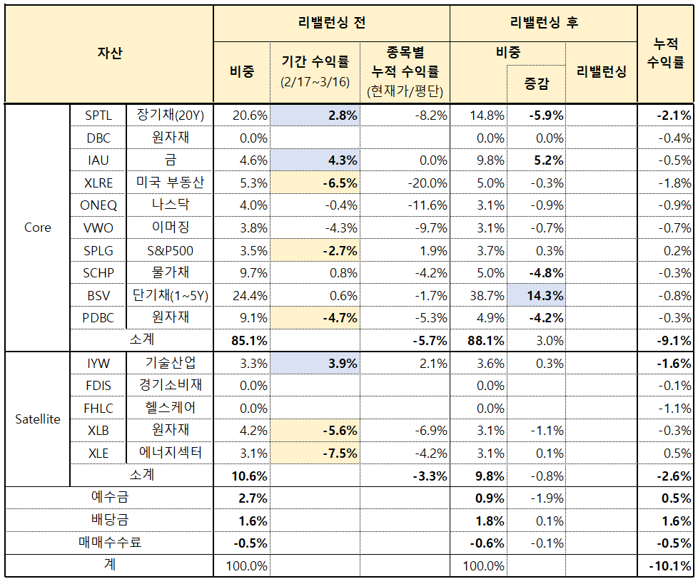 미국 ETF에 자산배분 방식으로 투자자문앱을 통해 간접투자로 진행하고 있으며 23년 4월 7차 리밸런싱이 이루어져 이에 대한 리뷰를 하겠습니다. 이번에는 거시경제 상황이 안정을 찾아 위험자산 비중을 확대했습니다 (장기채권 비중 증가). 23년 4월 리밸런싱 주식시장 리뷰 (3/17 ~ 4/14) 1. 3/17 ~ 4/14 동안 S&P500은 4.9%, 나스닥은 3.75% 상승했습니다. 패스파인더 맥시멈은 2.47% 상승했습니다. 2. 가파른 금리인상으로 시작된 실리콘밸리은행(SVB), 크레딧스위스 (CB) 등의 은행권 파산 우려가 각국 정부의 적극적인 개입으로 어느정도 해소되며 금융시장이 안정을 되찾았습니다. 3. 3월 22일 FED는 물가상승률 둔화 및 SVB 사태 등으로 인하여 0.25% 포인트만 금..
